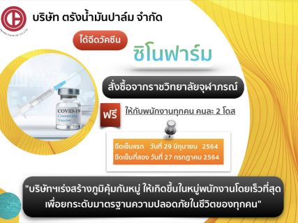 บริษัท ตรังน้ำมันปาล์ม จำกัด ดวัคซีนทางเลือกซิโนฟาร์มจากราชวิทยาลัยจุฬาภรณ์ (Sinopharm Vaccine) ระยะที่ 1 ให้กับพนักงาน