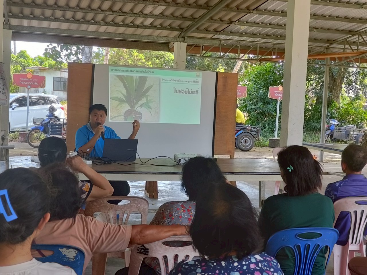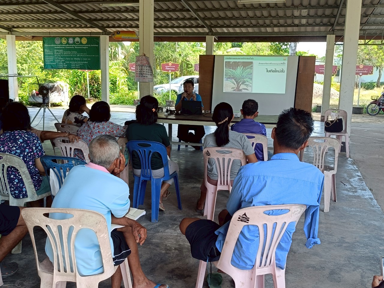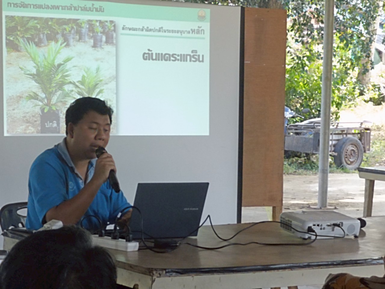 กิจกรรมเพิ่มประสิทธิภาพการผลิตปาล์มน้ำมันอย่างยั่งยืนตามมาตรฐานสากล ภายใต้กิจกรรมย่อยด้านการส่งเสริมกลุ่มเกษตรกรให้สามารถผลิตปาล์มน้ำมันได้อย่างยั่งยืนตามมาตรฐานสากล โดยมีเป้าหมายในการยกระดับกลุ่มเกษตรกรเข้าสู่มาตรฐาน RSPO จัดการอบรมหลักสูตร “การเพิ่มประสิทธิภาพการผลิตปาล์มน้ำมันอย่างยั่งยืนตามมาตรฐานสากล” ครั้งที่ 1 ณ แปลงใหญ่ปาล์มน้ำมัน หมู่ที่ 7 ตำบลชัยบุรี อำเภอเมืองพัทลุง จังหวัดพัทลุง